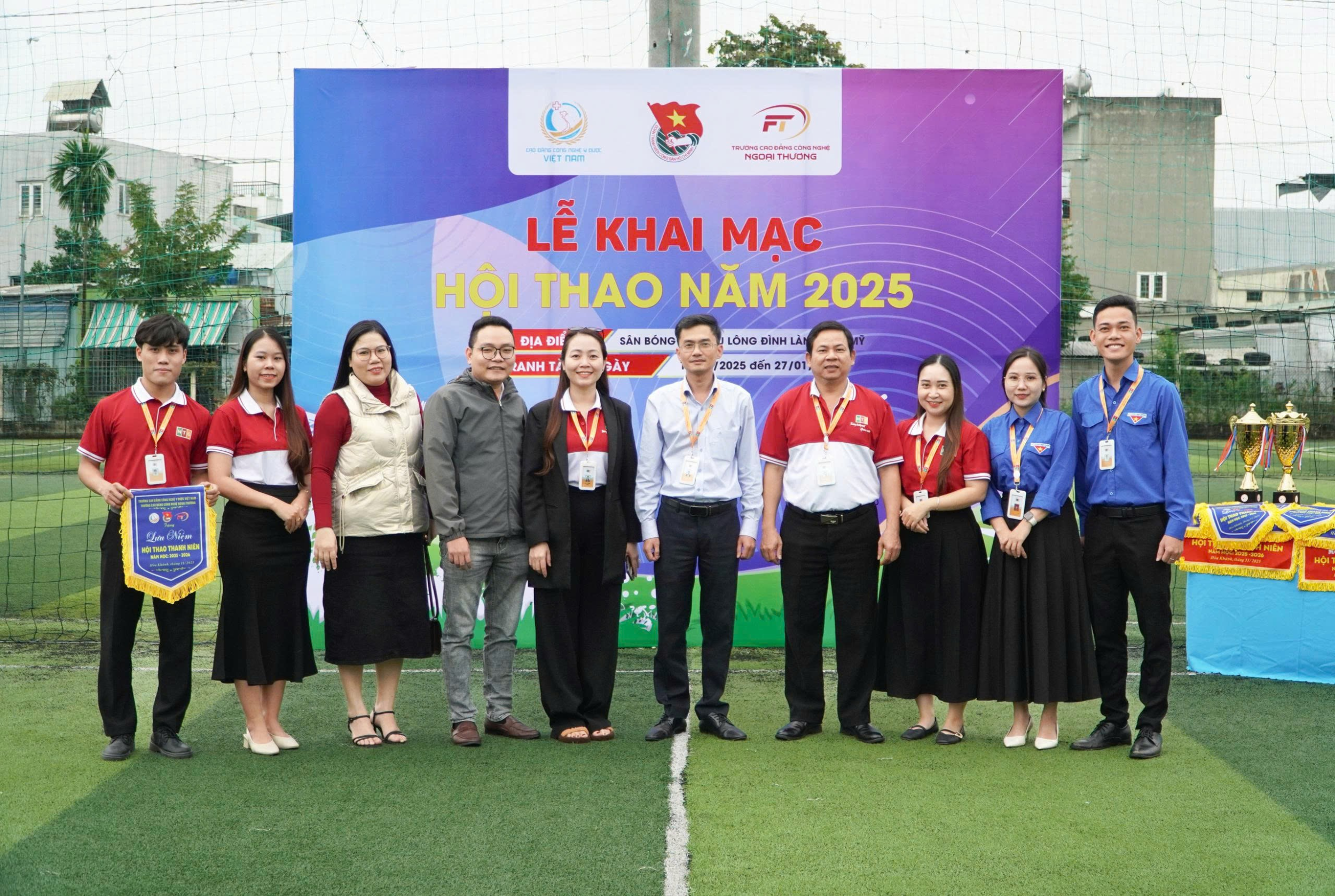 Sự kết hợp này góp phần mở rộng quy mô hoạt động, tăng tính giao lưu, gắn kết giữa sinh viên hai trường và tạo nên bầu không khí thi đấu chuyên nghiệp, thân thiện. Buổi lễ mở đầu với sự hiện diện của quý lãnh đạo, quý đại biểu, quý thầy cô giáo và các bạn vận động viên đến từ các chi đoàn. Những đoàn hàng trang nghiêm, sự hăng hái của các vận động viên cùng bài diễn văn khai mạc đã chính thức mở màn cho mùa Hội thao đầy cảm hứng. Các nội dung thi đấu năm nay gồm: 1. Môn bóng đá (tổ chức tại sân bóng Hòa Mỹ) với 13 đội bóng nam và 7 đội bóng nữ tham gia tranh tài, hứa hẹn mang đến nhiều trận đấu hấp dẫn, kịch tính. 2. Môn cầu lông (tổ chức tại sân Cầu lông Hòa Mỹ) thi đấu ở 3 nội dung: đơn nam, đơn nữ và đôi nam – nữ, với sự góp mặt của 12 đội đơn nam, 21 đội đơn nữ và 12 đội đôi nam – nữ. Không khí ngày khai mạc tràn đầy năng lượng. Trên gương mặt mỗi vận động viên là ánh mắt quyết tâm, hứa hẹn thi đấu hết mình, trung thực và cống hiến cho khán giả những màn tranh tài đẹp mắt. Hội thao không chỉ là cuộc so tài thể lực, mà còn là nơi để sinh viên thể hiện bản lĩnh, ý chí, tinh thần đoàn kết và trách nhiệm với tập thể. Sự tham gia đông đảo và nhiệt tình của các đội tuyển đã góp phần tạo nên bầu không khí thi đấu sôi nổi, chuyên nghiệp cho Hội thao năm nay. Lễ khai mạc Hội thao Thanh niên năm học 2025–2026 đã diễn ra thành công tốt đẹp, tạo nên khí thế sôi nổi mở đầu cho một mùa giải đầy hứa hẹn. Tin rằng với sự chuẩn bị chu đáo, tinh thần thi đấu tích cực và sự cổ vũ nhiệt tình của khán giả, Hội thao năm nay sẽ để lại nhiều dấu ấn đẹp, góp phần thúc đẩy phong trào thể dục thể thao và xây dựng môi trường học đường năng động, lành mạnh.